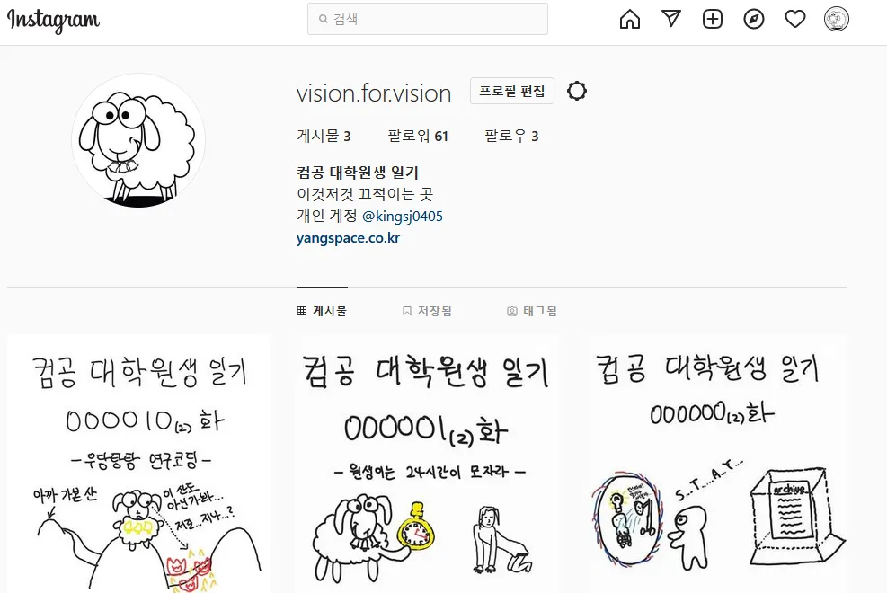 그리고 인스타그램에 그림일기를 좀 올렸다. 앞으로도 종종 심심하면 올릴 거긴한데 현재 진행 중인 프로젝트가 끝나야 좀 심심해지지 않을까... 생각보다 지인들이 많이 보는 거 같다.