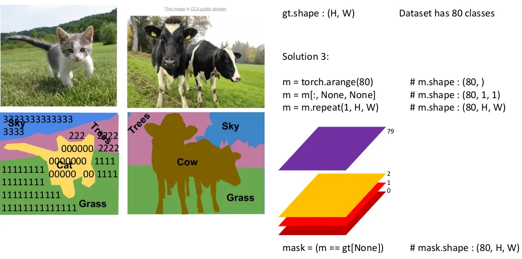 아래와 같이 80개의 클래스가 있는 segmentation map이 있는데 각 클래스 별 bit mask(80, H, W)를 만들고 싶다고 하자. 이 경우 아래와 같이 For loop을 사용하지 않고 해결할 수 있다.