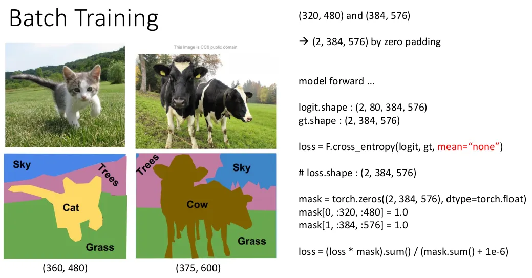 이미지 사이즈가 달라서 고민되는 경우 아래와 같이 그냥 zero padding을 해서 size를 맞추고 연산을 한 뒤에 Loss를 실제 이미지 영역에만 적용하는 게 더 좋다. GPU에서는 코어와 메모리가 충분하기 때문에 이렇게 하는 게 좋다. 실제로 Convolution 연산을 할 때도 im2col과 같은 연산들은 이런 패러다임으로 디자인 되어있다.