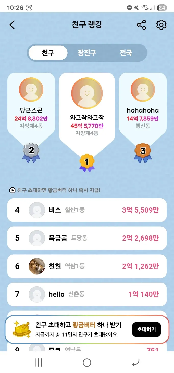 당근이 식빵 게임이라는 클리커 게임을 냈는데… 연구실 사람들이 너 뭐냐고 할 정도로 나랑 아내가 열심히 했다. 우리 동네에서 6등 13등을 달성했다. 음하하. 참고로 내가 와그작와그작.